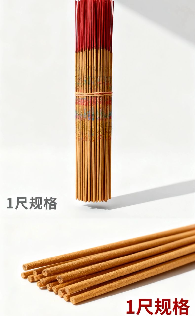 适合日常拜拜,燃烧时间较长,可用于家庭神桌、祖先供奉与一般祈福。1-foot incense sticks used for daily prayers, ancestor worship, and regular offerings. Burns longer than standard incense.